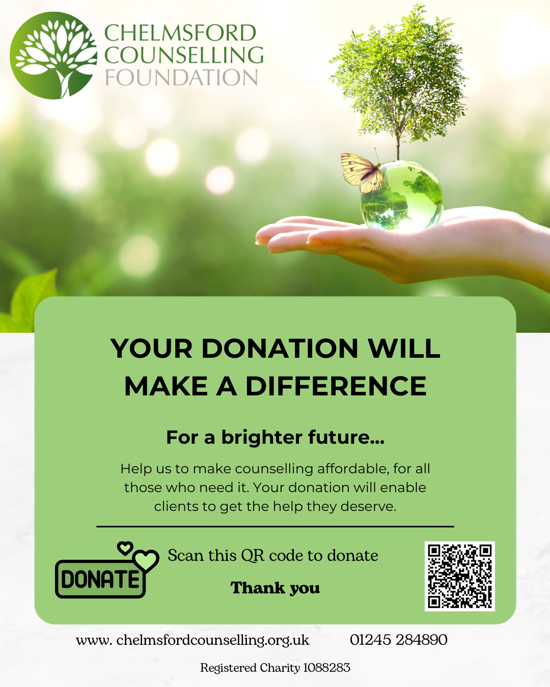 You can also donate via the Charities Trust where your kind and generous donation will come through to Chelmsford Counselling Foundation, where the donation can be put to good use over these next few months. Please click the button to donate or scan our QR code on the poster below.