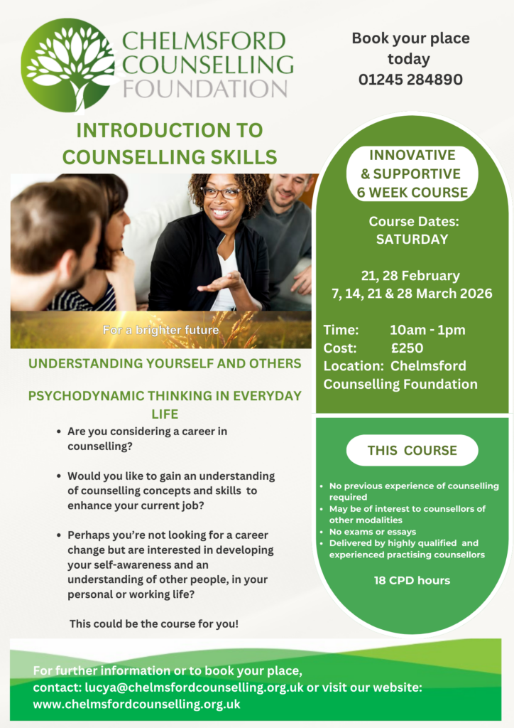 If you’re considering a career in counselling, or simply want to develop deeper understanding and communication skills for your current role, our 6-week training course at Chelmsford Counselling Foundation is a great place to start. Gain new insight in a supportive learning environment.